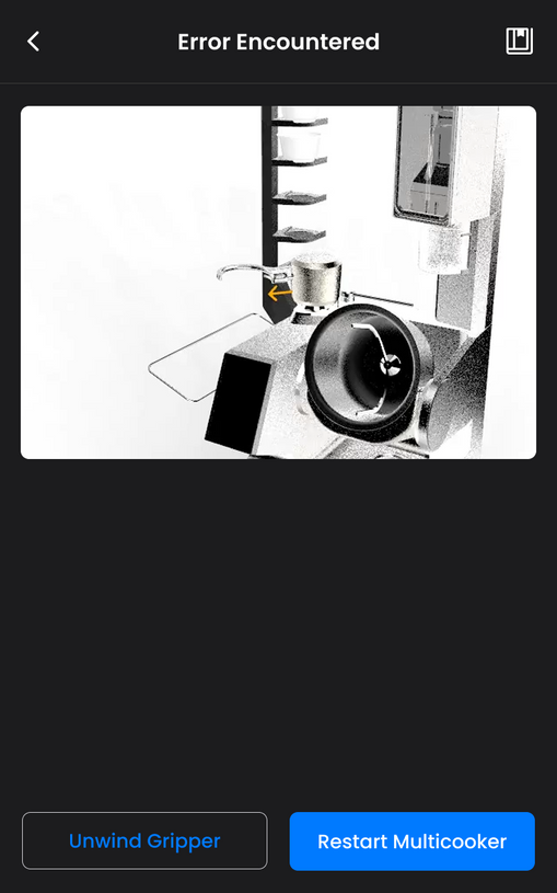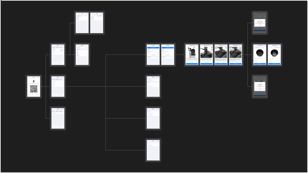 At times, the machine may encounter some mechanical errors or shut down on purpose due to human negligence, such as forgetting to clean sensors, improper pot installation, and allowing sticky residue to jam moving components. To accommodate these issues, a set of error pages were designed that not only informed users what happened, but also guided them to addressing these issues promptly. Working with our clients and multiple kitchen crews, custom icons were also created to help users differentiate easily what each issue was, and animations were included to help with the guidance (we found that words were too complex for older users as they are unfamiliar with modern machine operations).