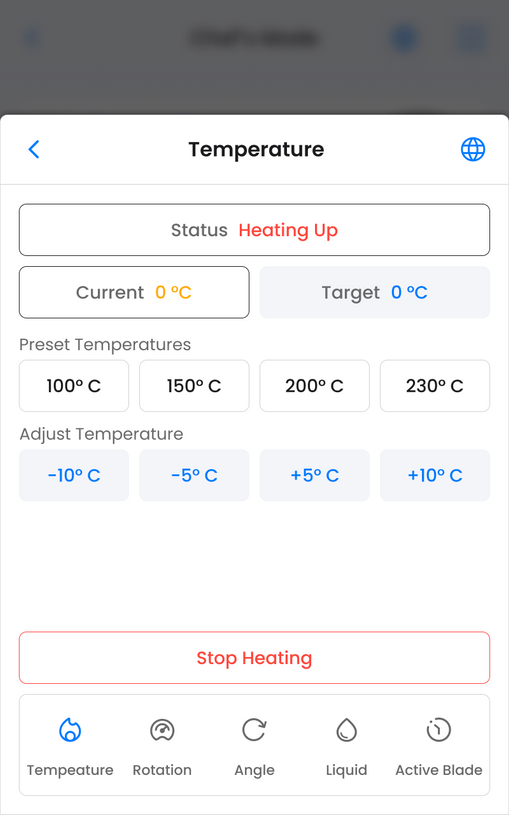 The second challenge was to allow users to quickly swap between functions in Chef's Mode, namely the "Active Blade", "Temperature", "Pot Rotation", "Pot Angle" and "Liquid" functions. To solve this, I utilized the same bottom taskbar design that is seen in the Home page. This similarity in design language not only helped users understand the functionality of this taskbar, but allowed users to immediate toggle between these difference functions, increasing the speed users could perform each step, reducing human delay and error.